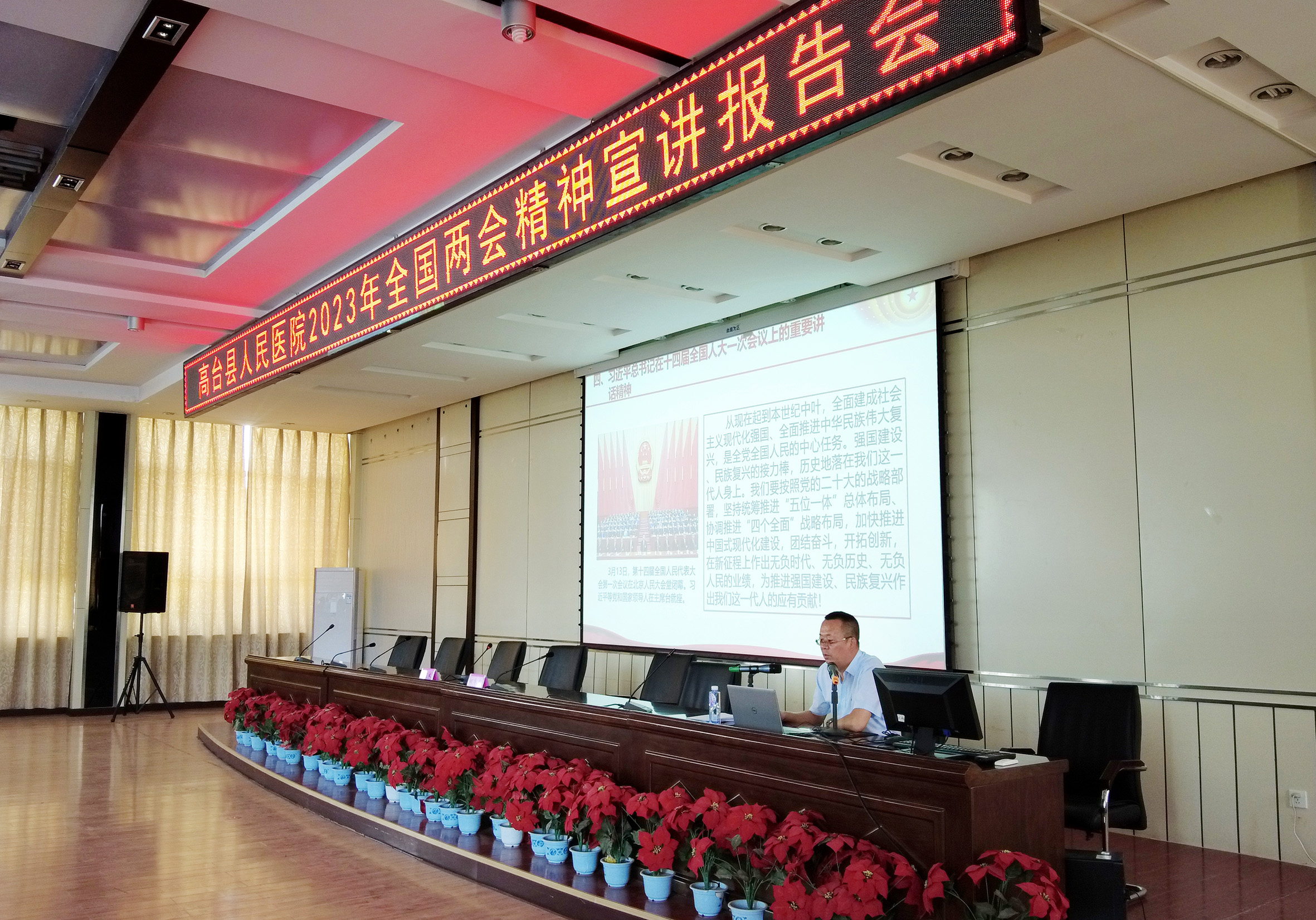 为学习贯彻习近平新时代中国特色社会主义思想,贯彻落实全国两会精神,5月18日下午,高台县人民医院召开2023年全国两会精神宣讲报告会。会议由高台县卫生健康局党组成员、副局长、县人民医院党委书记盛甫义同志作专题宣讲,高台县人民医院领导、中层领导、全体党员、全院职工300余人参加。