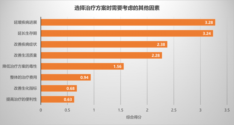 大部分医生选择治疗方案时主要考虑延长患者生存期、延缓疾病进展、改善疾病症状和改善患者生活质量。部分MM患者身体状况不佳,影响了药物治疗选择。根据中国临床肿瘤学会(CSCO)指南推荐,含蛋白酶体抑制剂的三药联合方案是新诊断MM患者首选的标准治疗方案,但高龄或体弱患者如无法耐受三药联合方案,可选用不含蛋白酶体抑制剂的两药联合方案。然而,不含蛋白酶体抑制剂的两药联合方案的疗效不如三药方案。如果三药方案使用低毒的蛋白酶体抑制剂,身体状况不佳的患者有望在耐受的同时得到更佳的疗效。TOURMALINE-MM1研究表明,与来那度胺+地塞米松的两药方案相比,伊沙佐米+来那度胺+地塞米松的三药方案除了显著延长复发/难治性MM患者的中位生存期,还能更有效地改善患者症状评分。这提示选择含伊沙佐米的三药方案的患者生活质量不一定比两药方案差。本次调研也发现,在选择MM患者的治疗方案时,除了考虑延缓疾病进展、延长生存期以及改善疾病症状之外,能够改善患者的生活质量也越来越引起医生的重视(图5)。