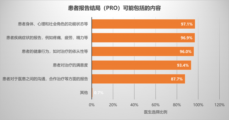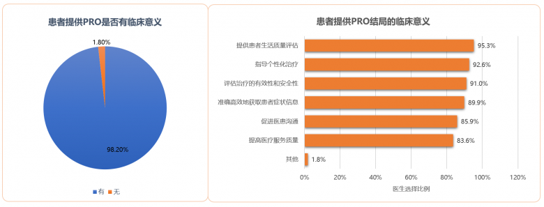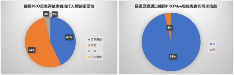 医生对PRO认识有限:参与调研的医生62.3%表示知道PRO,但是还没有在临床中用过,仅13.4%的医生不仅知道PRO,并且有使用经验,提示医生对PRO认识有限。医生认识或使用过的评价PRO结局量表(Patient-reported outcome measure,PROM)主要包括EORTC QLQ-C30、EORTC QLQ-MY20等,均是国际上最常用、覆盖维度较全面的评估肿瘤患者现阶段生命质量状况PRO量表。