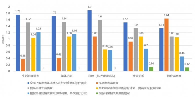 大部分医生认为PRO有临床意义,可指导MM患者个性化治疗和进行生活质量评估:有98.2%医生认为PRO有临床意义(图1),如果MM患者提供PRO结局信息,可对患者生活质量进行评估、指导个性化治疗以及评估治疗的有效性和安全性等。关于PRO评估内容,95%以上医生认为应集中在患者身体、心理和社会角色的功能状态,患者疾病症状的报告以及患者健康行为等方面。另外,还包括患者对治疗的满意度,以及患者对医患之间的沟通、合作治疗等方面的报告(图2)。