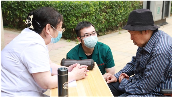 医务人员为现场社区居民提供健康咨询、量血压和测血糖等服务项目,并指导居民正确的血压、血糖测量方式。