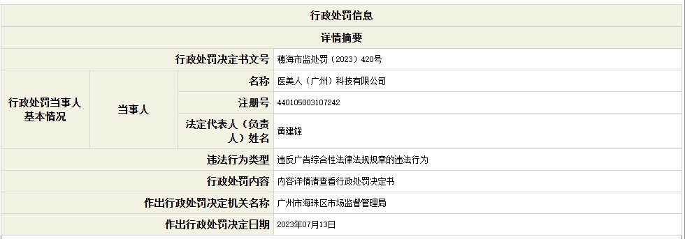 7月13日,广州市海珠区市场监督管理局对医美人公司作出行政处罚,没收广告费用21250元,罚款60万元。