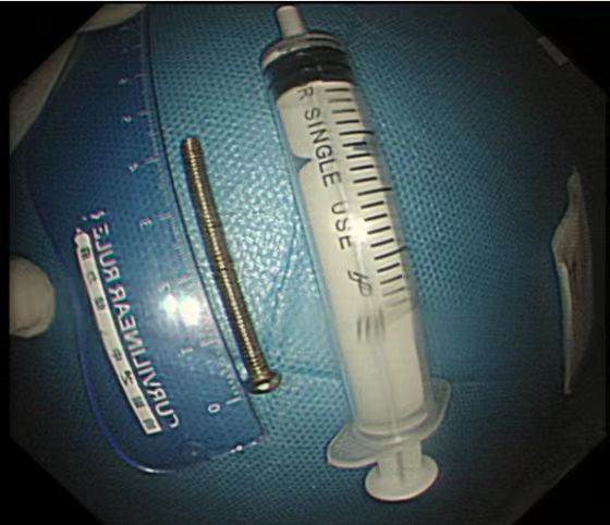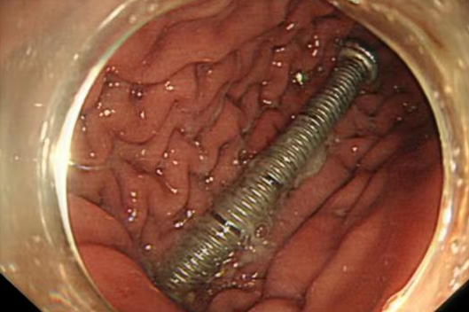 医护人员凭借多年的经验和密切配合,先将螺丝钉从十二指肠取出到胃内,然后不断调整螺丝钉的角度,最终顺利将螺丝钉从胃内取出。