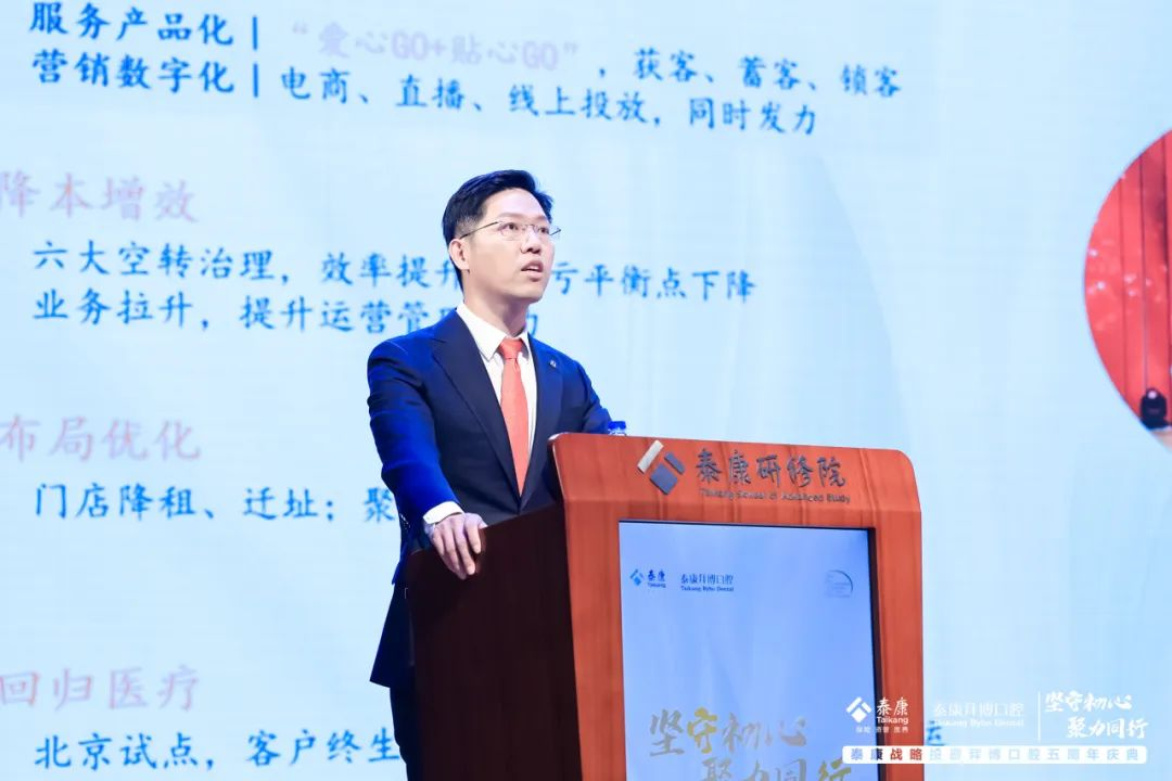 泰康保险集团管委会成员、泰康拜博口腔首席执行官陈宏华回顾了泰康投资拜博五年来的不平凡之路,五年来泰康拜博口腔一直在初心的引领下、在战略的指引下交出了一份坚实的答卷,实现了泰康拜博的脱胎换骨。
