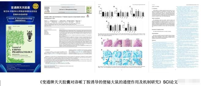 其中,实验室研究成果《变通牌天天胶囊对洛哌丁胺诱导的便秘大鼠的通便作用及机制研究》更是被SCI期刊《Journal of Ethnopharmacology(民族药理学杂志)》刊发,同时还出具了通便功能及机制和免疫功能调节作用两大研究报告,成功申报了“增强胃肠动力,促进消化的新应用”、“增加胃肠蠕动、促进胃肠排空新应用”、“增加肠道粘液层,保护肠道新应用”、“增加肠道水分,润滑肠道的新应用”、“增强免疫力的新应用”五项专利,通过充足而科学的证据,用事实证明,用数据说话。