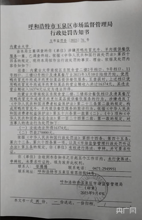 9月4日,根据群众举报,内蒙古呼和浩特市玉泉区市场监督管理局调查终结内蒙古大学南校区东院食堂涉嫌用鸭肉冒充牛、羊肉提供餐饮服务一案,并向内蒙古大学下达行政处罚告知书。