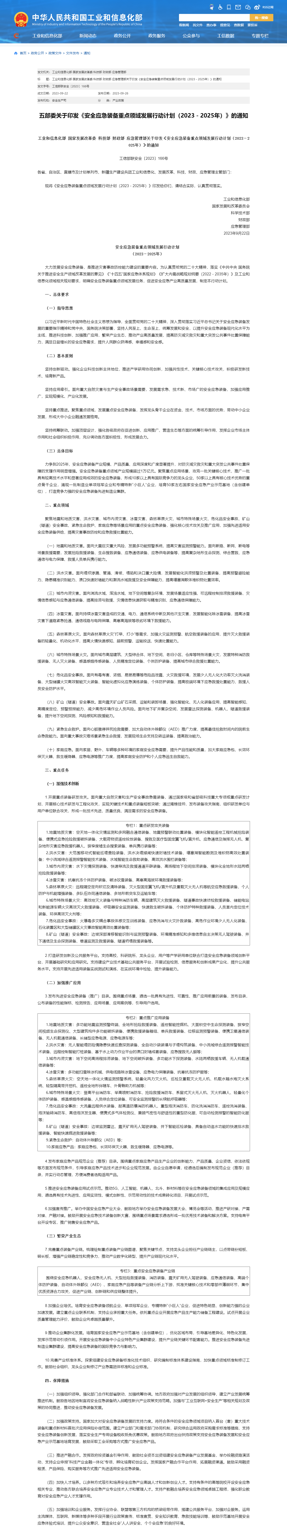 工信部官网消息,近日,工业和信息化部、国家发展改革委、科技部、财政部、应急管理部等五部门联合印发《安全应急装备重点领域发展行动计划(2023-2025年)》。其中提出,力争到2025年,安全应急装备产业规模、产品质量、应用深度和广度显著提升,对防灾减灾救灾和重大突发公共事件处置保障的支撑作用明显增强。安全应急装备重点领域产业规模超过1万亿元。聚焦重点应用场景,攻克一批关键核心技术,推广一批具有较高技术水平和显著应用成效的安全应急装备,形成10家以上具有国际竞争力的龙头企业、50家以上具有核心技术优势的重点骨干企业,涌现一批制造业单项冠军企业和专精特新“小巨人”企业,培育50家左右国家安全应急产业示范基地(含创建单位),打造竞争力强的安全应急装备先进制造业集群。