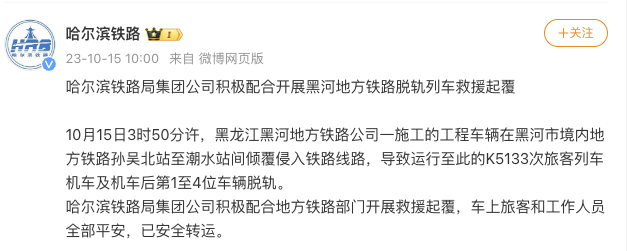据@哈尔滨铁路通报,10月15日3时50分许,黑龙江黑河地方铁路公司一施工的工程车辆在黑河市境内地方铁路孙吴北站至潮水站间倾覆侵入铁路线路,导致运行至此的K5133次旅客列车机车及机车后第1至4位车辆脱轨。哈尔滨铁路局集团公司积极配合地方铁路部门开展救援起覆,车上旅客和工作人员全部平安,已安全转运。