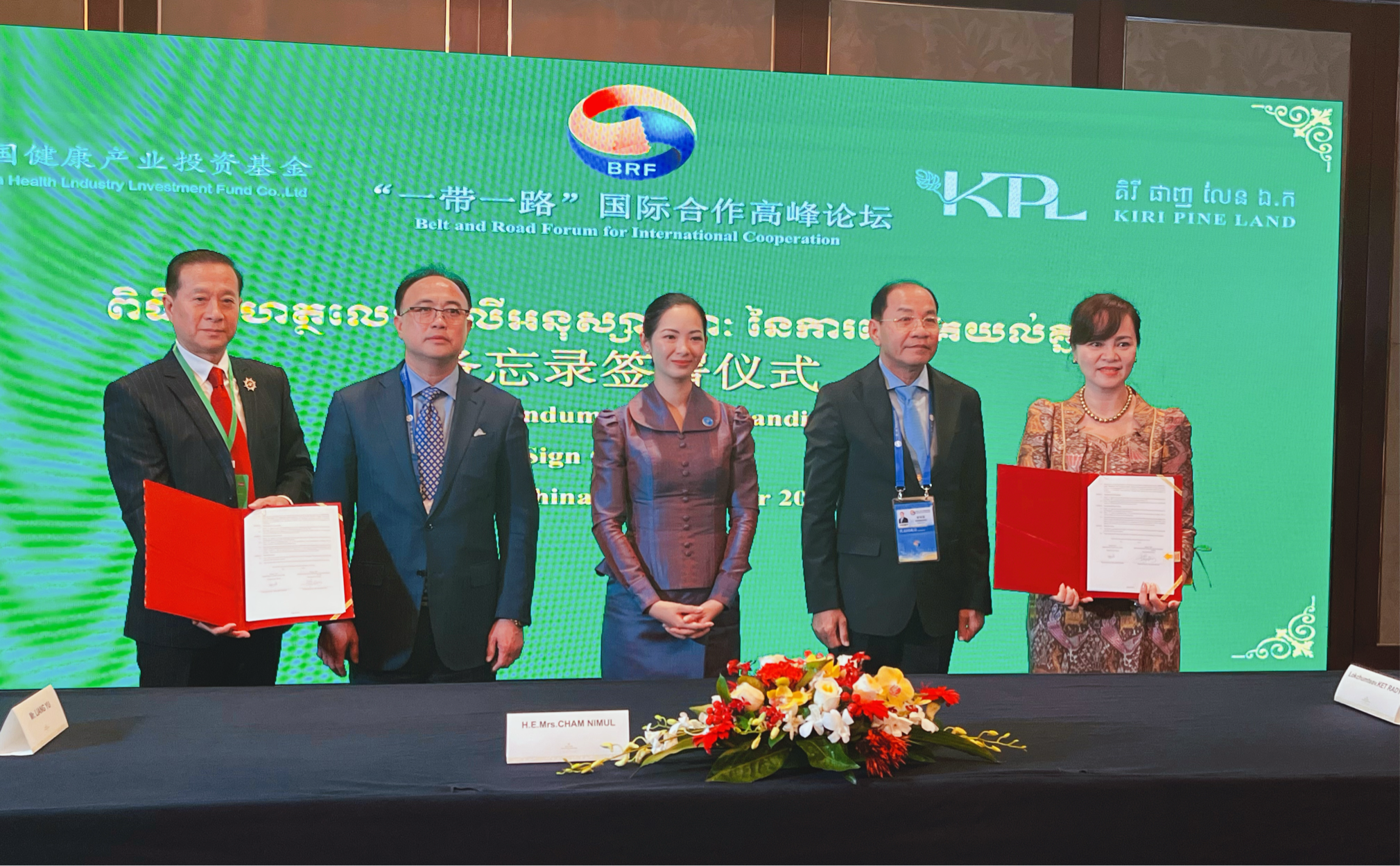 10月17日,第三届“一带一路”国际合作高峰论坛期间,柬埔寨KIRI PINE LAND CO,.LTD与中国健康产业投资基金管理股份有限公司在京签署中医药中心(中柬)国际合作园区项目备忘录。