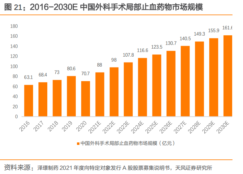 根据 Frost & Sullivan的预测,中国外科手术台数将在2030年达到12828.9万台,2020-2030E年均复合增长率为7.3%,中国外科手术局部止血药物市场规模也达到161.6亿元,2020-2030E年均复合增长率为8.6%。
