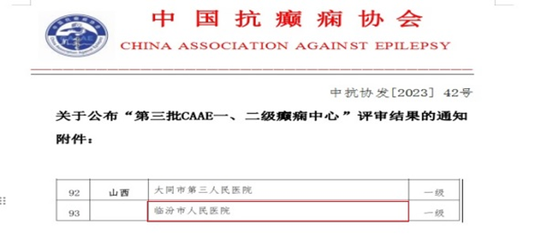 近日,临汾市人民医院癫痫中心顺利通过评审,成为晋南地区首家中国抗癫痫协会(CAAE)“一级癫痫中心”。