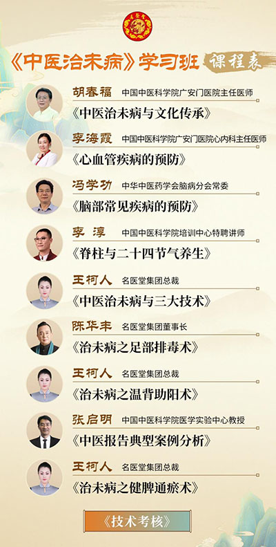 中医治未病学习班由中医药领域众多知名专家、学者进行授课,集长年学术研究、临床验证及讲授经验凝练开发,内容实用性强,专业度高,更注重理论+实践的办学理念,将博大的中医药文化理论融会贯通地传授给学员。学习班的同学们在轻松活跃的课堂氛围中汲取丰富的中医药专业知识、掌握更全面的健康服务业技能,更好地为广大群众提供优质健康服务。