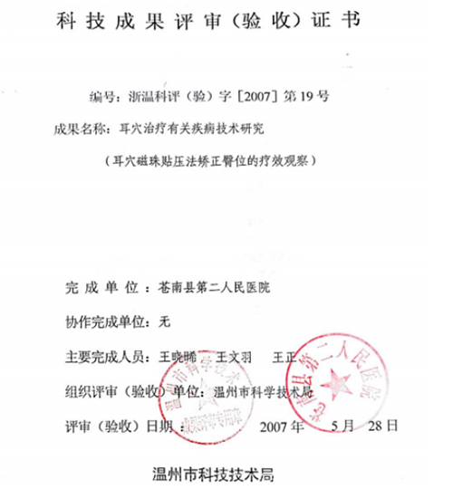 2007年,王正研究的“耳穴磁珠贴压法矫正臀位”成果,被温州市科学技术局通过评审。评审意见认为,耳穴磁珠贴压法具有见效快、疗程短、无痛苦等特点,优于胸膝卧位法,填补省内空白,属国内领先,值得推广应用。