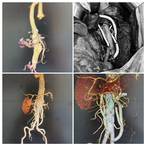 甘肃省中心医院麻醉手术二部有西北地区首家“双C+飞龙+滑轨CT”于一体的复合手术室,精良的手术设备为手术的成功奠定了基础。医务部组建了强大的多学科专家诊疗团队,制订了详细而周全的手术方案,术前进行了充分的评估和准备。鉴于王伯病情危重且紧急,手术团队决定采用腹主动脉瘤切除+人工血管置换术+腹腔干动脉人工血管重建+肠系膜上动脉人工血管重建+双肾动脉人工血管重建+胸腹主动脉瘤腔内支架修复术。